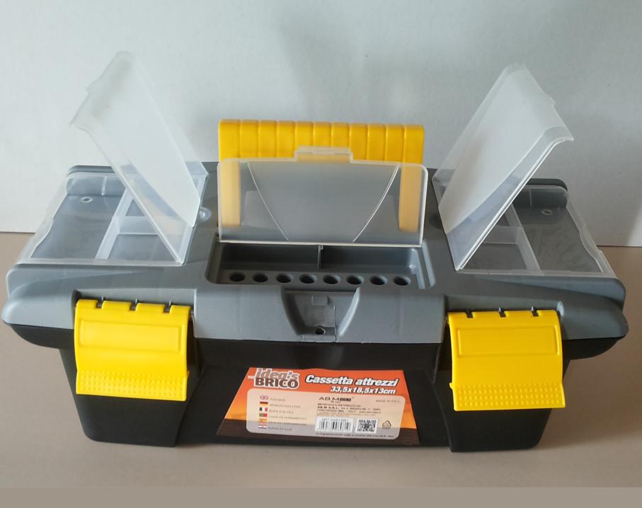 Cassetta attrezzi 33.5x18.5x13 cm, 1 contenitore interno estraibile con scala graduata,2 contenitori estraibili (indipendenti) per minuteria,1 contenitore minuteria con alloggiamento per punte avvitatore. [BOX CATT813981] € --> € 8.20 | Valigetta per minuteria e piccoli attrezzi in plastica colorata,21 scompartimenti; Dim.: 27x20.5x7 cm [BOX VAL004] € 5.50 --> € 3.91 |